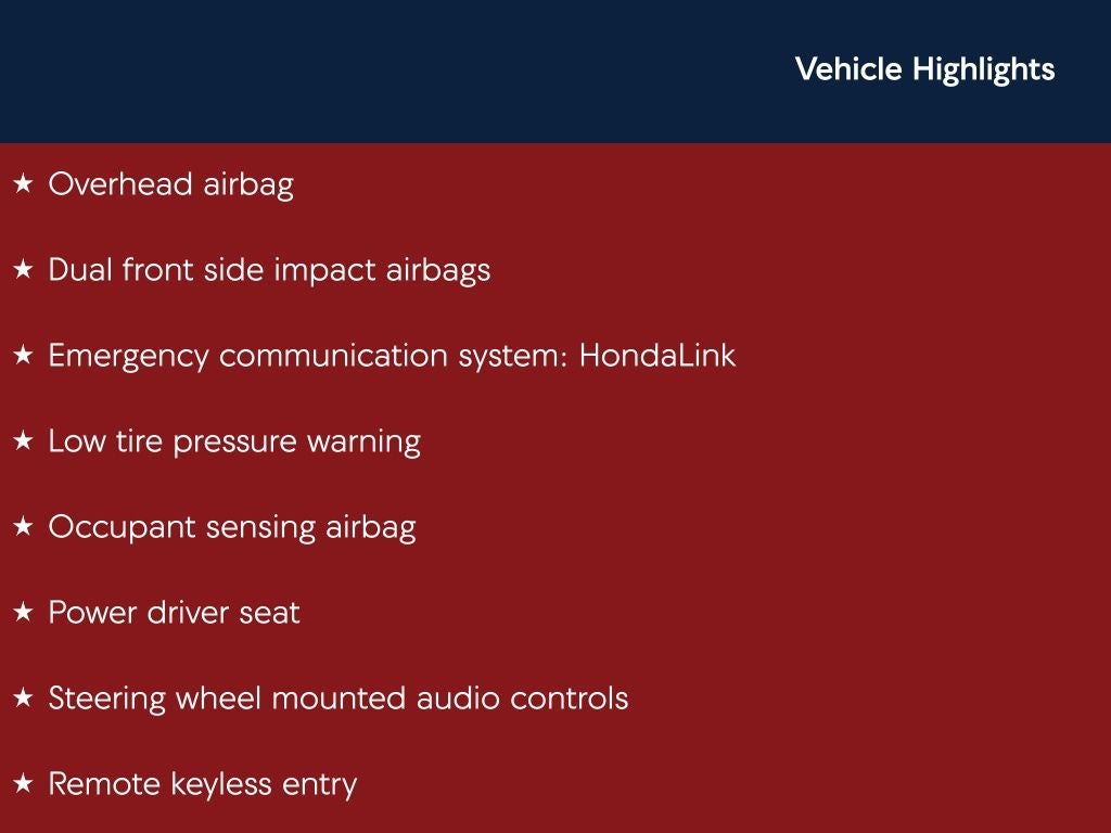 Platinum White Pearl Sport FWD CVT 1.5T I4 DOHC 16V Turbocharged VTEC Back Up Camera, Bluetooth®, Black w/Cloth Seat Trim, 4-Wheel Disc Brakes, 8 Speakers, ABS brakes, Apple CarPlay/Android Auto, Auto High-beam Headlights, Automatic temperature control, Brake assist, Dual front impact airbags, Dual front side impact airbags, Electronic Stability Control, Emergency communication system: HondaLink, Exterior Parking Camera Rear, Four wheel independent suspension, Front anti-roll bar, Front Center Armrest, Front dual zone A/C, Front fog lights, Fully automatic headlights, Knee airbag, Low tire pressure warning, Occupant sensing airbag, Overhead airbag, Panic alarm, Passenger door bin, Power door mirrors, Power driver seat, Radio: 180-Watt AM/FM Audio System, Rear anti-roll bar, Rear window defroster, Remote keyless entry, Security system, Speed control, Speed-sensing steering, Speed-Sensitive Wipers, Split folding rear seat, Steering wheel mounted audio controls, Telescoping steering wheel, Tilt steering wheel, Traction control, Variably intermittent wipers, Wheels: 19 Machine-Finished Alloy w/Black Inserts.