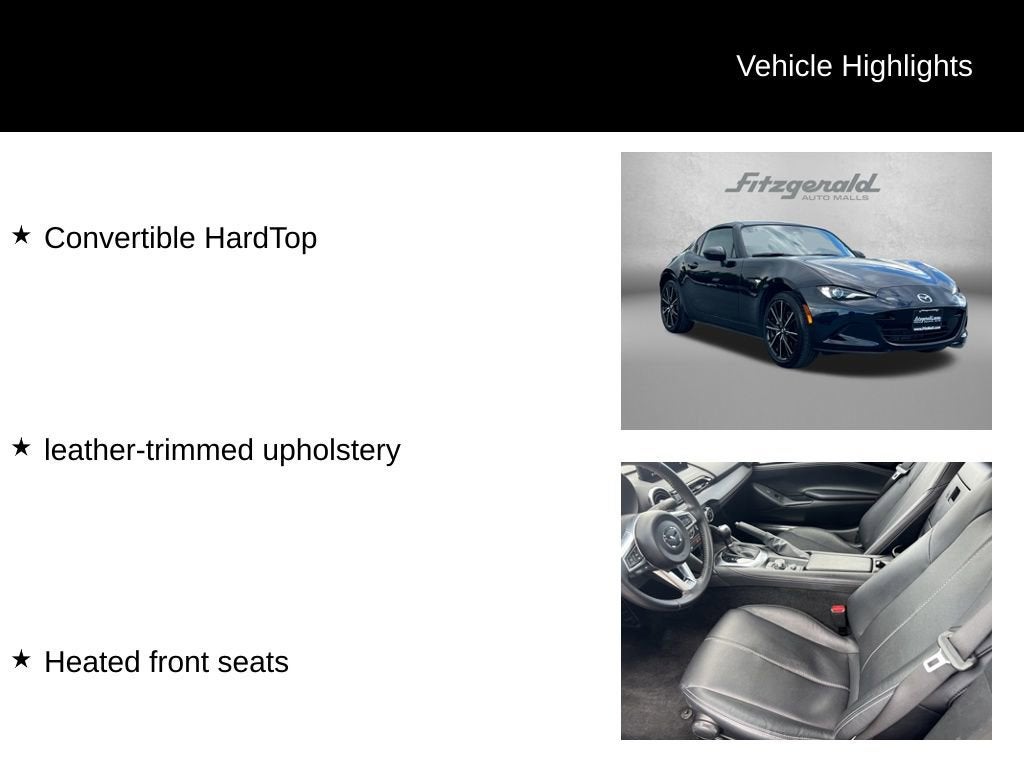 2025 Jet Black Mica Mazda MX-5 Miata RF 6-Speed Automatic Convertible HardTop, Heated front seats, leather-trimmed upholstery. 2.0L 4-Cylinder DOHC 16V Grand Touring You will love our NO HAGGLE, NO HASSLE PRICING here at Fitzgerald Auto Mall. Ask us about our BUYER PROTECTION PLAN, LOANER CAR PROGRAMS, AND FREE Vehicle History Report. Can not find what you want?? NO PROBLEM! We have over 1,000 Pre-Owned vehicles available at WWW.FITZMALL.COM. You can also visit us in person at 114 Baughmans Lane Frederick MD, 21702 or Call Us @240-629-7301.