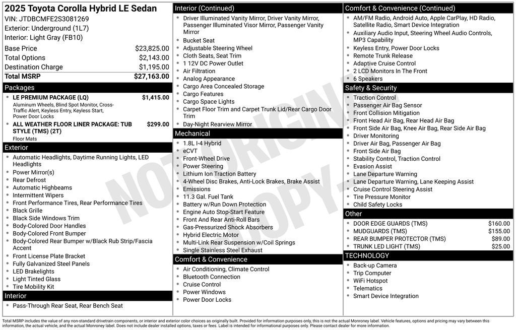 Underground LE FWD CVT 1.8L DOHC 16V VVT Back Up Camera, Bluetooth®, Alloy Wheels, Audio Controls on the Steering Wheel, Clean Cloth Interior, Cruise Control, Dual Climate Control, Proximity Keyless Entry, Push Button Start, Rear View Camera, Satellite Radio, Side Air Bags, 1.8L DOHC 16V VVT, 16 Alloy Wheels, 6 Speakers, Air Conditioning, Apple CarPlay/Android Auto, Auto High-beam Headlights, Blind Spot Monitor, Brake assist, Door Edge Guards, Dual front side impact airbags, Electronic Stability Control, Emergency communication system: Safety Connect (up to 10-year trial subscription), Exterior Parking Camera Rear, Front anti-roll bar, Fully automatic headlights, LE Premium Package, Mudguards, Power door mirrors, Qi-Compatible Wireless Smartphone Charger, Radio: 8 Toyota Audio Multimedia, Rear Bumper Protector, Rear window defroster, Smart Key System, Steering wheel mounted audio controls.