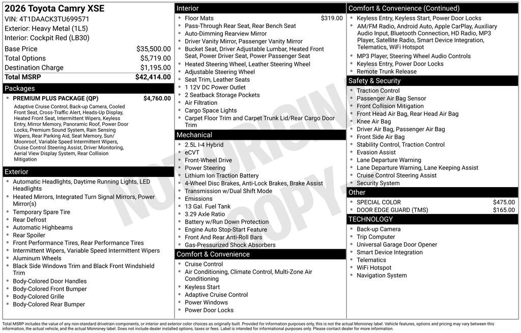 Heavy Metal XSE FWD eCVT 2.5L 4-Cylinder 16V DOHC Sunroof / Moonroof, Back Up Camera, Bluetooth®, Clean History Report, a Clean, One Owner Carfax, Cockpit Red w/Leather Seat Trim, 10 Color Head-Up Display, 4-Wheel Disc Brakes, 9-Speaker JBL Premium Audio System, ABS brakes, AM/FM radio: SiriusXM, Apple CarPlay/Android Auto, Auto High-beam Headlights, Automatic temperature control, Brake assist, Digital Key Compatibility, Driver's Seat and Outer-Mirror Memory, Dual front impact airbags, Dual front side impact airbags, Electronic Stability Control, Emergency communication system: Safety Connect (5-year trial), Exterior Parking Camera Rear, Four wheel independent suspension, Front and Rear Parking Assist with Automatic Braking, Front anti-roll bar, Front Center Armrest, Front Cross-Traffic Alert, Front dual zone A/C, Fully automatic headlights, Heated door mirrors, Heated Front Seats, Heated steering wheel, Knee airbag, Lane Change Assist, Low tire pressure warning, Navigation system: Drive Connect (1 year trial) includes Cloud Navigation with real time traffic and Google POI, Occupant sensing airbag, Overhead airbag, Panoramic Glass Roof, Panoramic View Monitor, Passenger door bin, Power door mirrors, Power driver seat, Power passenger seat, Premium Plus Package, Radio: 12.3 Toyota Multimedia Audio, Rain-Sensing Windshield Wipers, Rear anti-roll bar, Rear Cross-Traffic Braking, Rear window defroster, Remote keyless entry, Security system, Speed-sensing steering, Split folding rear seat, Steering wheel mounted audio controls, Telescoping steering wheel, Tilt steering wheel, Traction control, Traffic Jam Assist, Variably intermittent wipers, Ventilated Front Seats, Wheels: 19 Smoked Gray and Black-Finished Alloy.